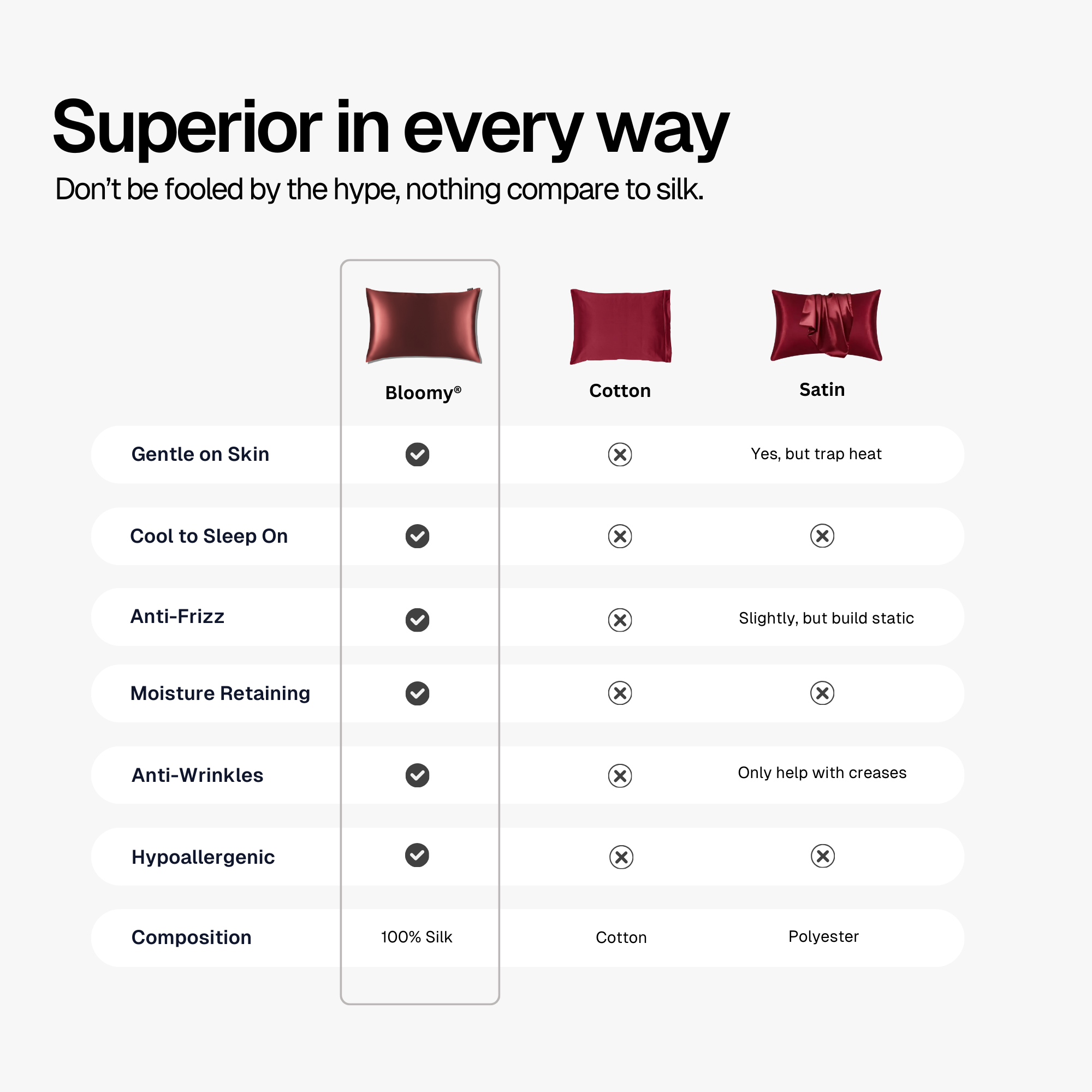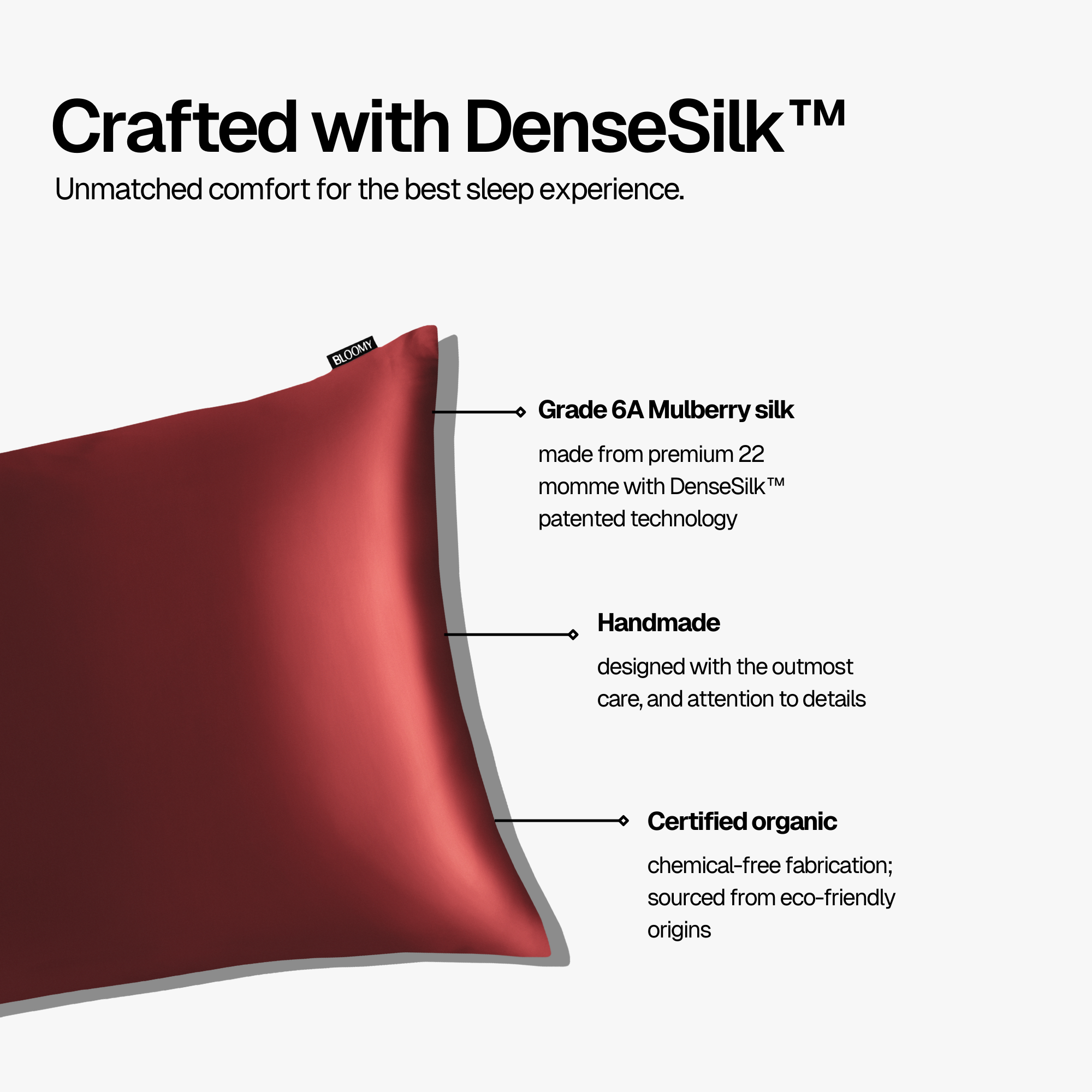 Bloomy DenseSilk™ ultra-smooth surface minimizes friction, meaning less pulling on your skin as ayou sleep. This helps visibly diminish fine lines and wrinkles, giving you a fresher, more youthful appearance in just a few nights.