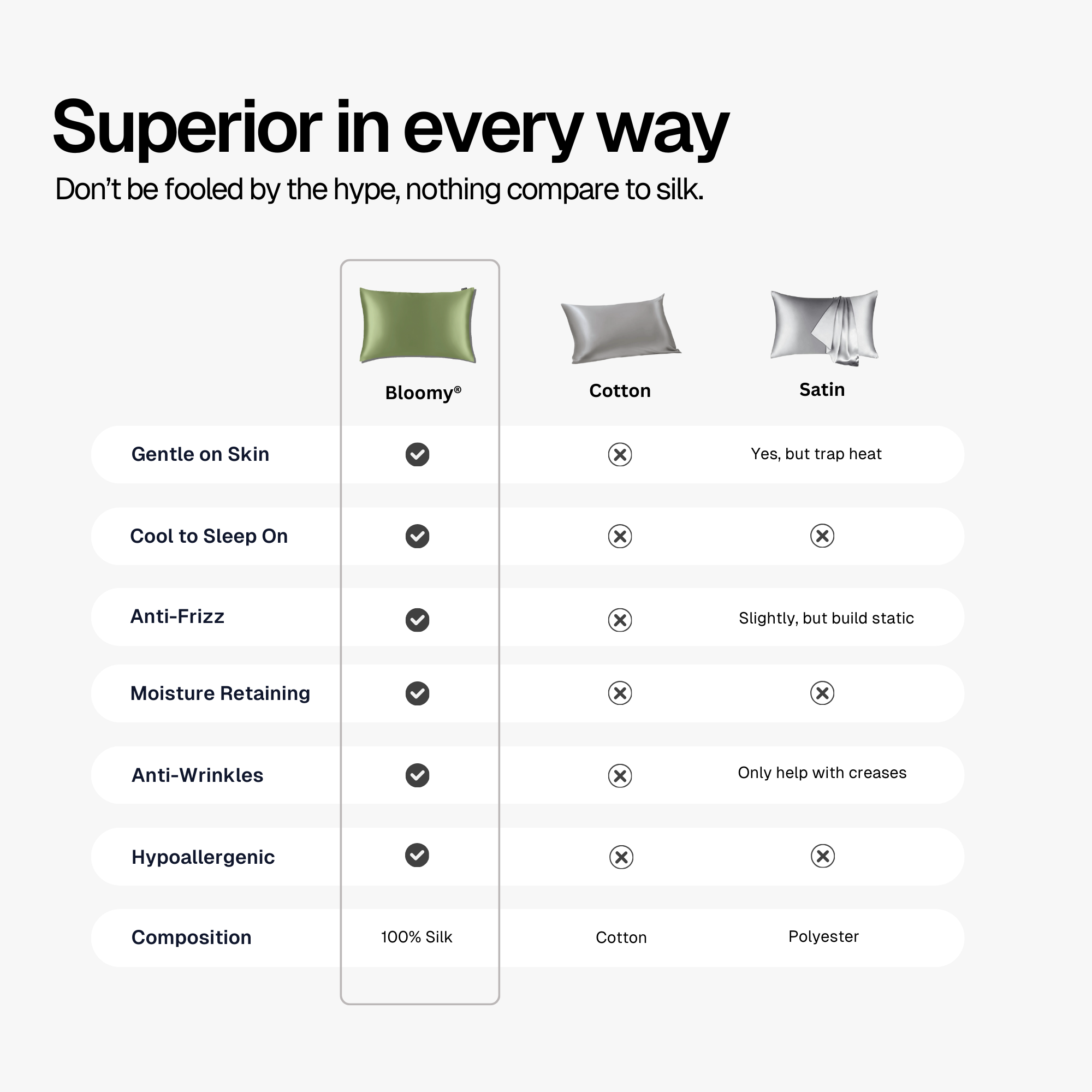 Unlike cotton, which tends to trap heat, the smooth, breathable structure of Bloomy® olive silk allows air to circulate freely, preventing heat buildup and keeping you cool for the dreamiest sleep.